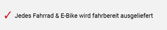 Dank unserer intelligenten und durchdachten Shop Filter, findest du schnell zu deinem gewünschten Bike. Sie ermöglichen dir zum einen, mit Hilfe der Suchfunktion nach einem konkreten Produkt zu suchen oder aber, dank einer leicht zu bedienenden und umfassenden Kategorie- und Filterauswahl, deine Suche auf das Gewünschte zu konzentrieren. All dies ist möglich auch wenn du unterwegs bist, da es unsere Homepage selbstverständlich auch in mobiler Version gibt. Wenn du dich für den Kauf eines Fahrrades entschieden hast, werden sich unsere Mitarbeiter um eine fachgerechte Montage des Fahrrades kümmern. Die Bremsen als auch die Schaltung des Fahrrades werden so eingestellt, dass du dich darum nicht mehr kümmern musst. Anschließend wird das Fahrrad Probe gefahren und in einem sicheren Karton bestens verpackt an die Spedition übergeben. Um mit dem Fahrrad eine erste Tour zu unternehmen, benötigt es nur ein paar wenige Handgriffe: Die Pedale und der Lenker müssen nach Montageanleitung angebracht bzw. gerade gestellt werden. Das ist alles! Da wir über ein großes Warenlager verfügen, können wir dir eine schnelle Bearbeitung deiner Bestellung und Auslieferung der Ware garantieren.